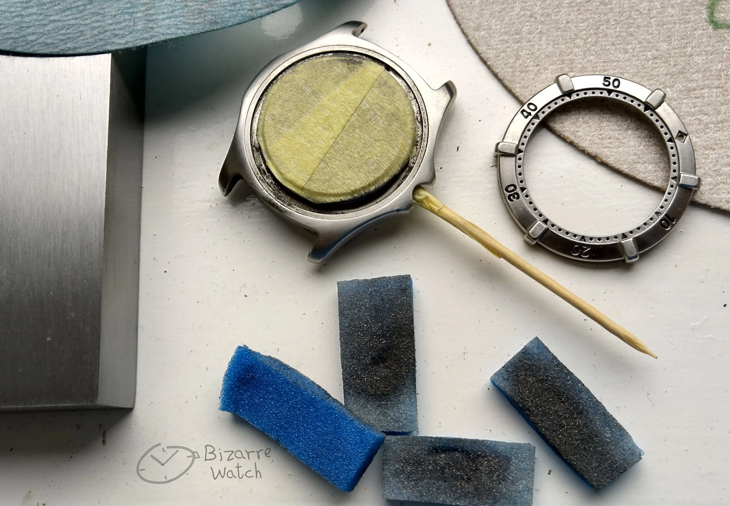 The stainless steel case and bezel were sanded to get rid of scratches and scuffs. Deep dents are harder to remove as this would remove too much material. The alternative is laser welding followed by sanding but you’d risk discolouration if the exact stainless steel grade is not used.
